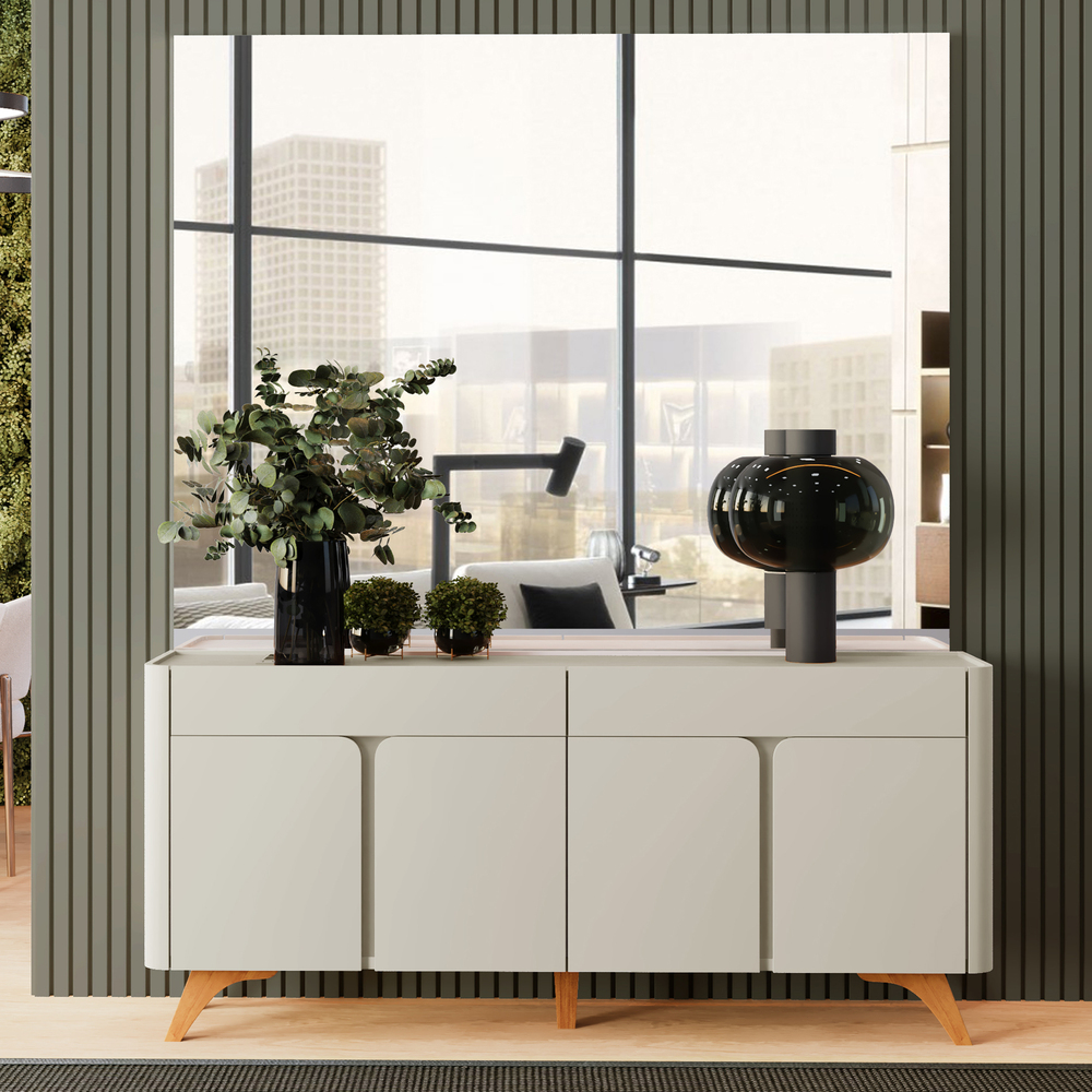 O Buffet Aros de 4 portas possui um lindo charme e sofisticação, um produto com design moderno em curva, possuindo vista flex em duas cores, além de dobraciças em slow motion. O buffet além de ter esse lindo design, ainda possui perfeito pés de madeira maciça. Um produto perfeito para colocam em qualquer cômodo de sua casa. Esse produto possui nas cores Off White e Off White com Naturalle. OBS: ESPELHO NÃO INCLUIDO