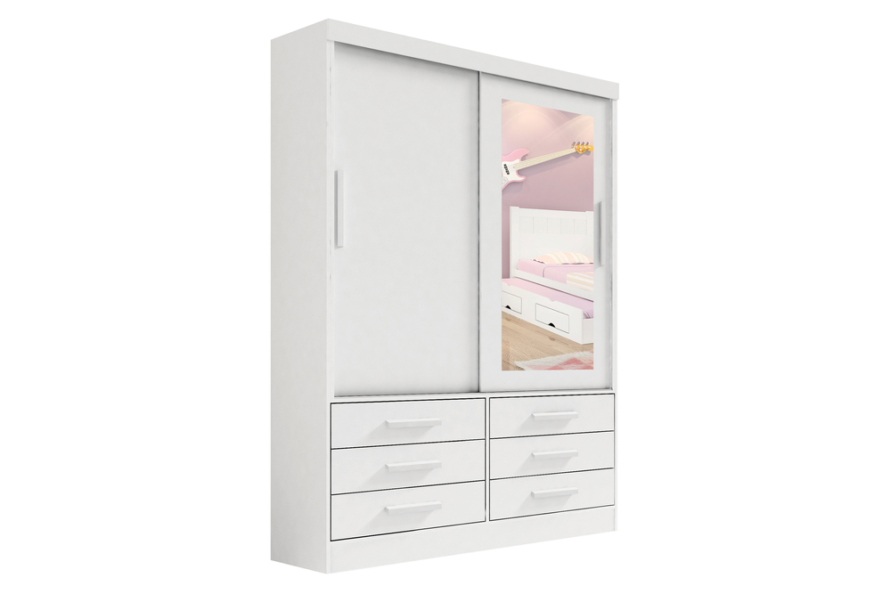 ? 2 portas de correr e 6 gavetas; ? Portas, Moldura e Frente Gavetas em MDF; ? Corrediça telescópica 40cm; ? Profundidade da gaveta 40cm; ? Abertura total da gaveta; ? Suporte cabide metálico; ? Cabideiro em alumínio; ? Produzido com chapa de 15mm; ? Pé opcional; ? Trilho antiquedas de portas.