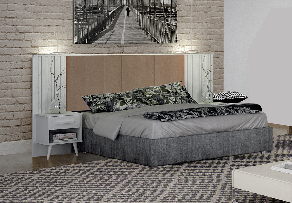 O conjunto acompanha dois criados-mudos, que oferecem apoio funcional para objetos do dia a dia, ajudando a manter o espaço organizado. Seu design permite diferentes formas de instalação, adaptando-se facilmente ao layout do quarto.