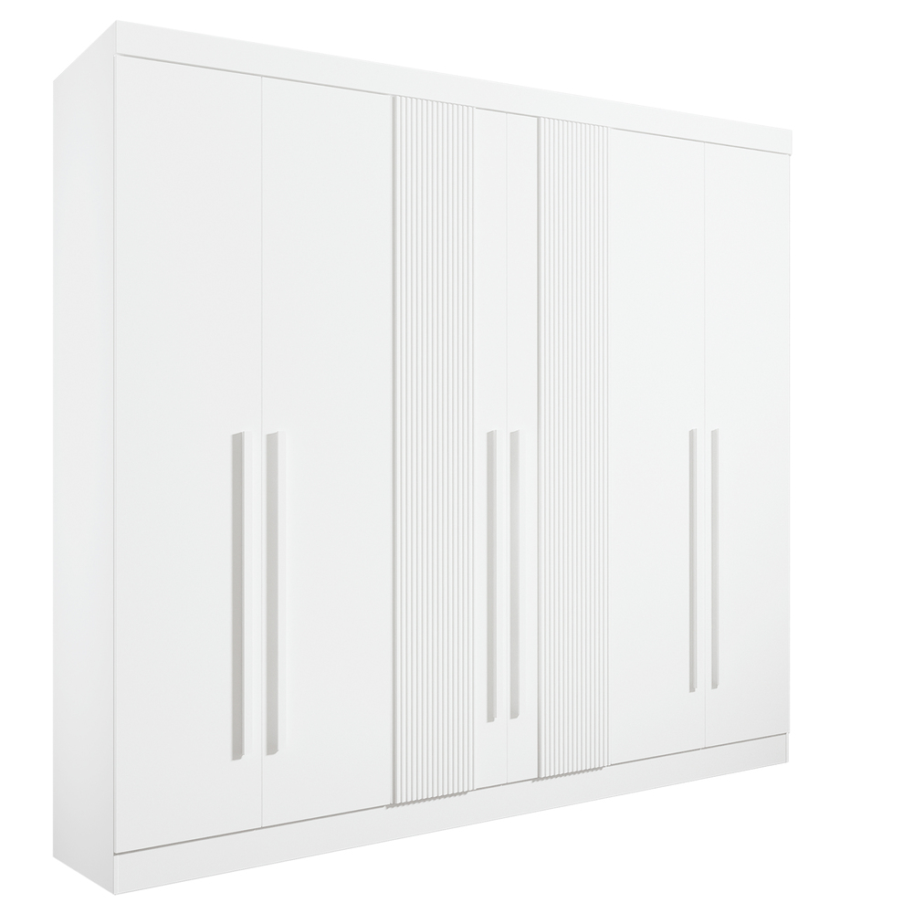 Roupeiro 100% MDF Produzido com Chapa de 15mm e 25mm; Acabamento externo pintura UV Escala de brilho alto brilho Quantidade de Gavetas 6 Material da gaveta MDP/MDF Corrediças da gaveta telescópica Material do puxador da gaveta alumínio Profundida da gaveta 40 cm Abertura total da gaveta Sim Peso máximo por gaveta 5 Kg Numero de portas 6 Material do puxador das portas madeira Número de prateleiras 8 Material das prateleiras MDP/MDF Peso máximo das prateleiras 5 kg Números de cabideiros 3